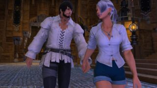 『自分を見る』ミコッテ♂『通常立ち姿』ヒューラン♀<頭の角度かえたりする角度調整等必要>腰を抱けますSS提供:蒼月傷様