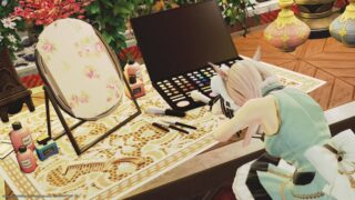 『座る』(表情:心配) アウラ♀『渡す』(表情:悪だくみ) ミコッテ♂相手をターゲットしたままグルポ起動。カメラの位置を調節SS提供:Luka'a様