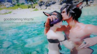 ミコッテ♂(通常立ち姿)『笑う』アウラ♀ねぇ、あのね?風SS提供:しゃけとまと様